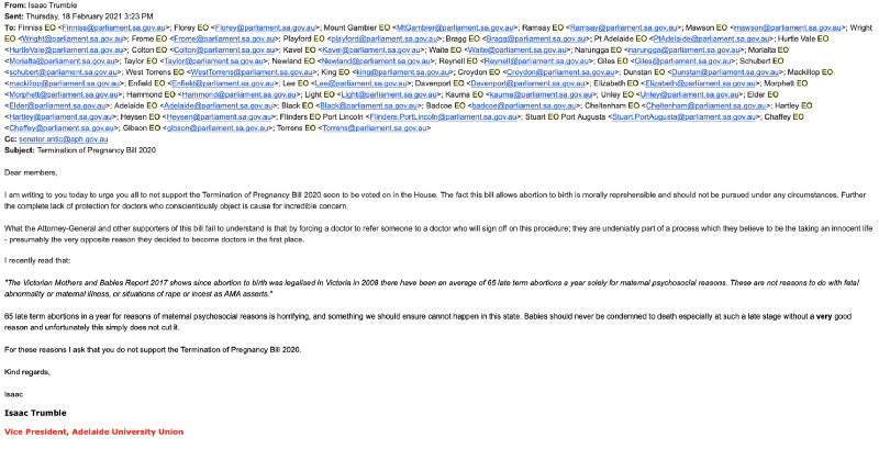 Student union Vice-President, Isaac Trumble, encouraged Members of Parliament to vote down the SA abortion reform bill using his union email signature