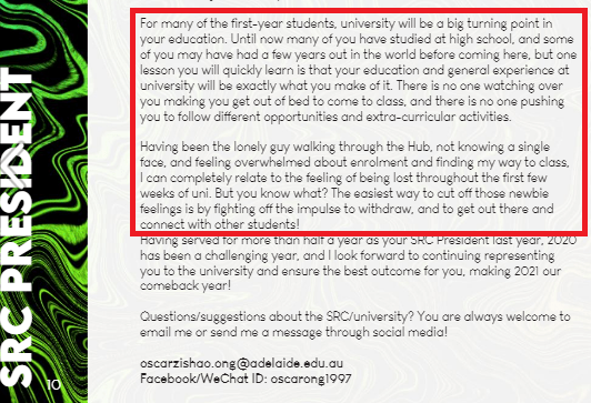 Former Adelaide University Union President (2019) and current Student Representative Council President (2020–) Oscar Ong has, in a stroke of political genius, shown his hand by plagiarising significant portions of his regular SRC President’s address in this year’s very first edition of On Dit. Oscar sneakily passed off the words and experiences from a regular State of the Union AUU President’s address from Issue One of On Dit 2017 (coincidentally enough this was my last year of high school) made by fellow former AUU President and also former fellow Progress leader, Brodie Scott, as his own. On Dit does not have an academic dishonesty policy, and thus this flashing red Turnitin score is an absolute power move on Oscar’s behalf.