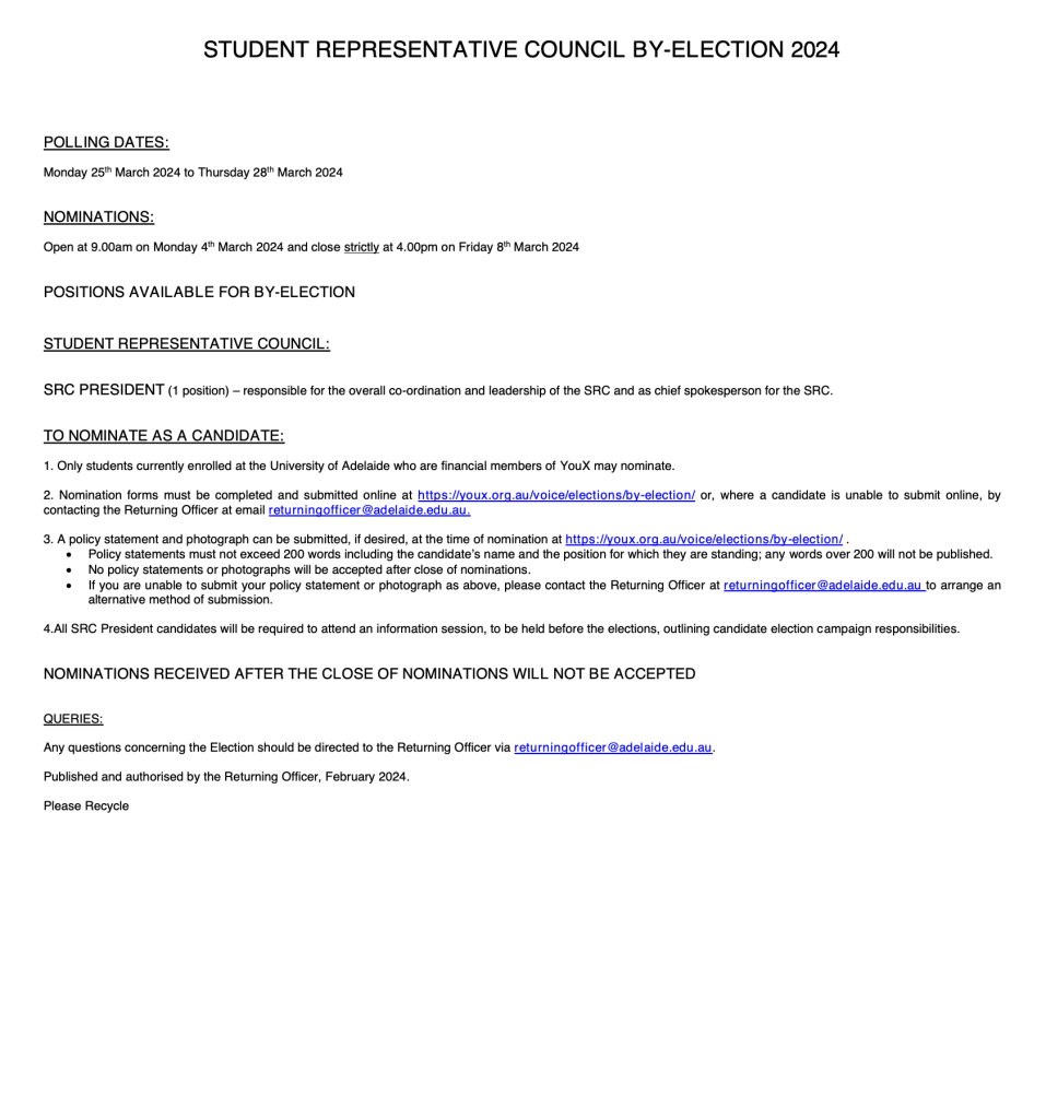 For any questions or clarifications, reach out to the Returning Officer at returningofficer@adelaide.edu.au.